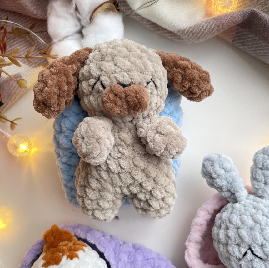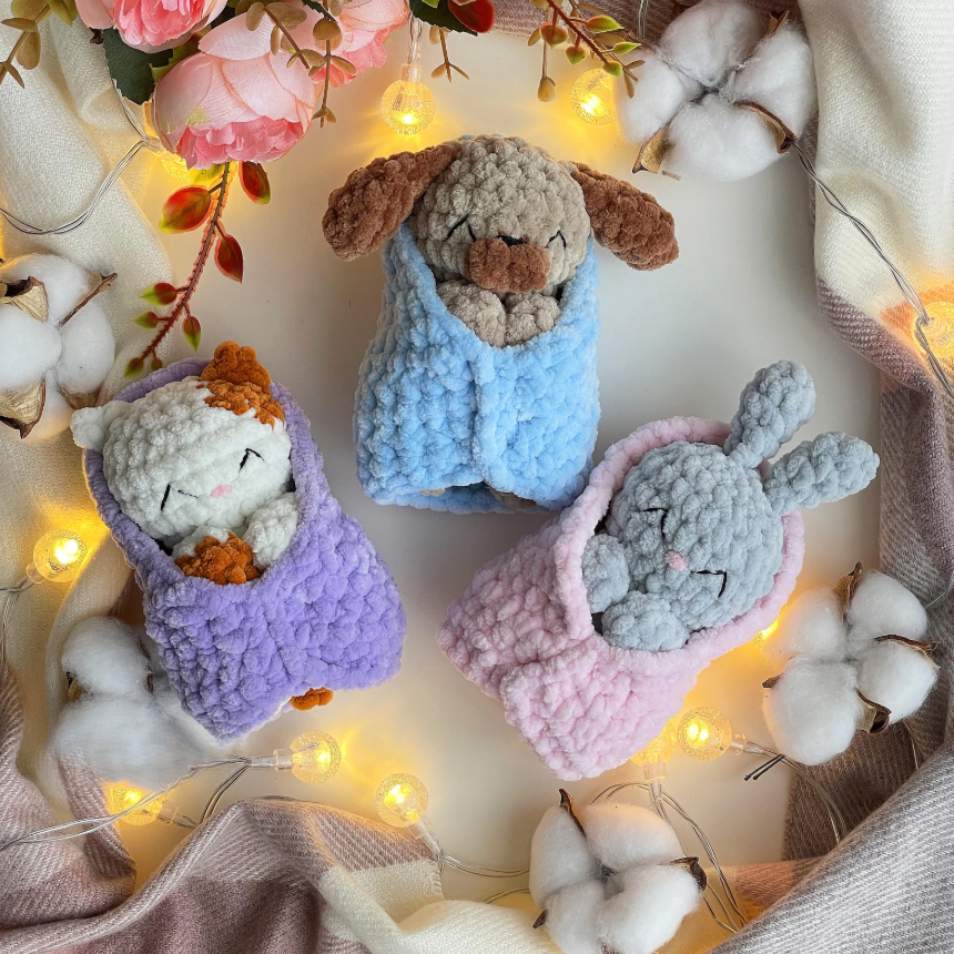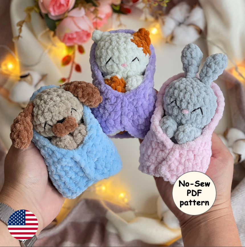 Make your own set of cozy bedtime buddies with this Sleeping Kitty, Bunny & Puppy Crochet Pattern Set! These adorable plushies are tucked in under soft blankets—and the best part? No sewing required! 🧶💤