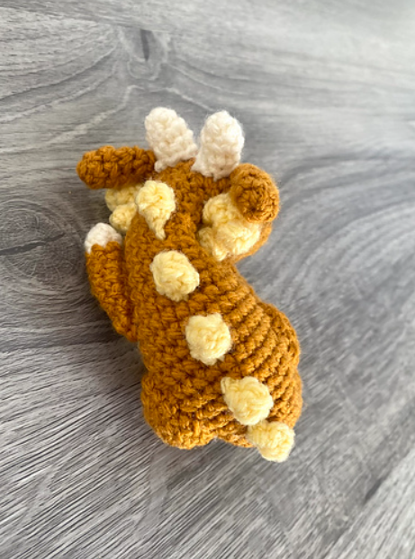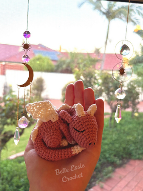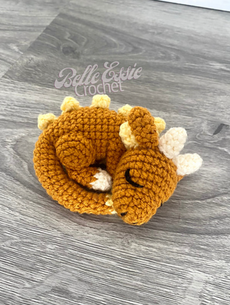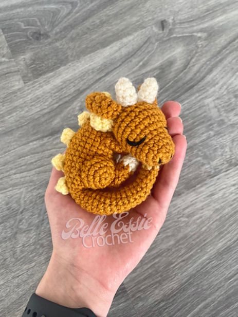 The images in this pattern are of a dragon I made out of 4 Seasons Marvel 8ply yarn, in three different colours. I used a 3.5mm hook. with this yarn and hook size, the dragon is small enough to fit into your cupped hand. Larger hook and yarn sizes can be used, and they will create much larger dragons.